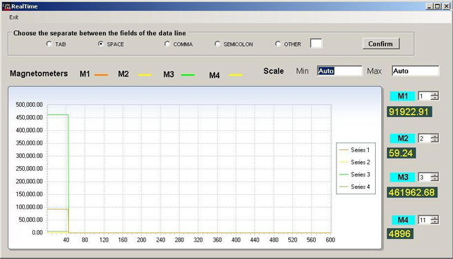 As shown below, users can capture real-time sampling on main window while plotting on other windows simultaneously. User can select the columns to monitor magnetic fields simultaneously up to four channels. By changing the Min/Max values manually, the plot can be zoomed in/out. It is very useful to set up, tune system.